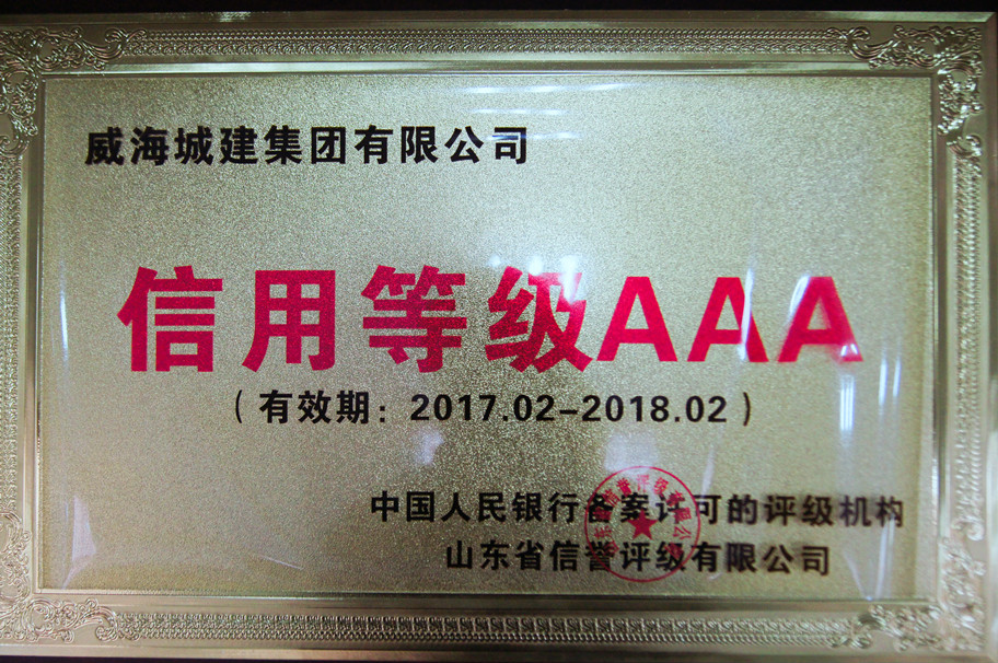 證書名稱:信用等級AAA企業(yè) 獲證單位:威海城建集團有限公司 發(fā)證單位:山東省信譽評級有限公司