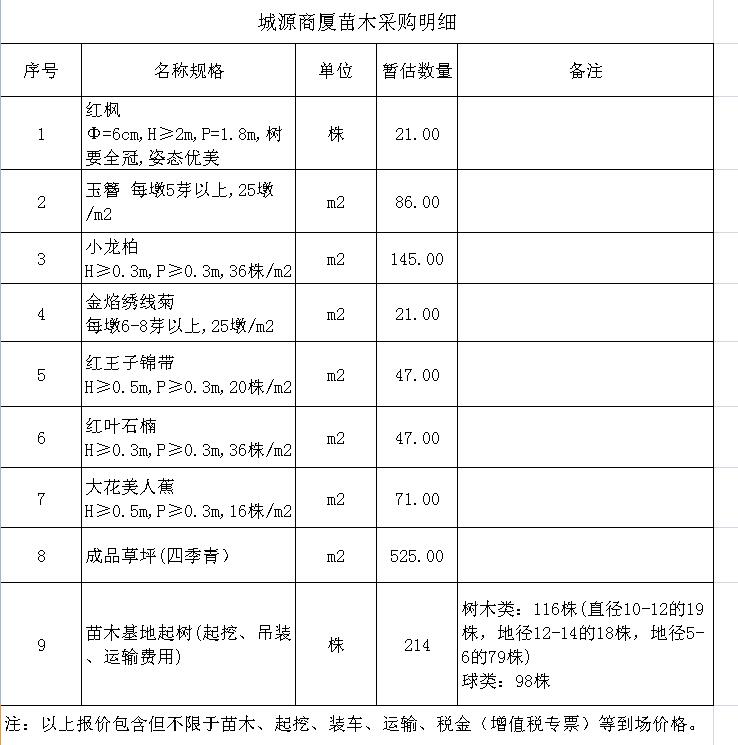 (4)采購(gòu)內(nèi)容:城源商廈項(xiàng)目綠化苗木的采購(gòu)及苗木基地樹(shù)苗的起挖、裝車并運(yùn)輸?shù)焦さ刂付ǖ攸c(diǎn),采購(gòu)清單詳見(jiàn)附件。